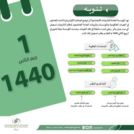 نوّهت المؤسسة العامة للتأمينات الاجتماعية، عن إتاحتها للعاملين في الجهات الحكومية والمؤسسات والهيئات العامة الخاضعين لنظام التأمينات الاجتماعية، تسجيل أيّ مدد عمل بأثر رجعي (مدد سابقة) في تلك الجهات.